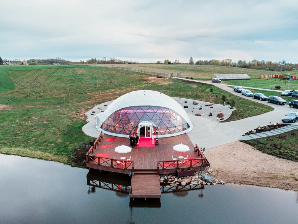 The “VIP Dome” project in Liutonys, Lithuania, is a distinctive and exclusive space designed for events, conferences, and other special occasions. The dome itself covers an area of 254 square meters, complemented by a VIP loft space of 100 square meters. Nestled in the picturesque Degučiai Valley, this modern structure is built using cutting-edge technology, offering a sense of luxury and elegance.