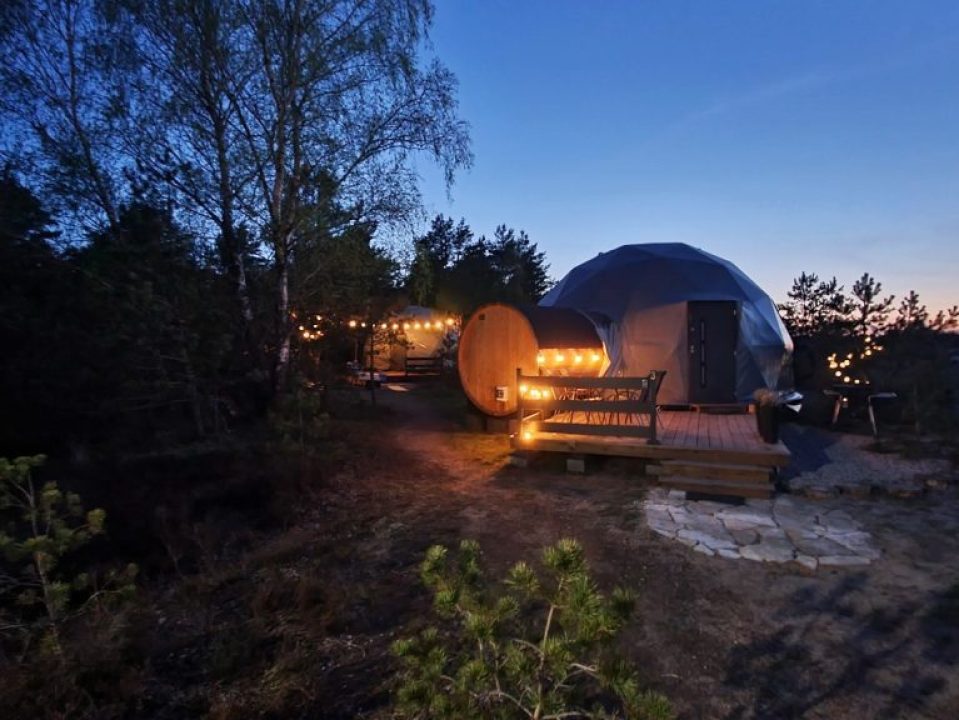Introduction of this season, a 8 meter diameter dome of 50 m2 – GLAMPING DOME. One can watch the sunsets through the dome window during any weather. The dome is adapted for air temperatures of -30 to +80 degree Celsius and has a THERMIC.PRO13+ thermal membrane.