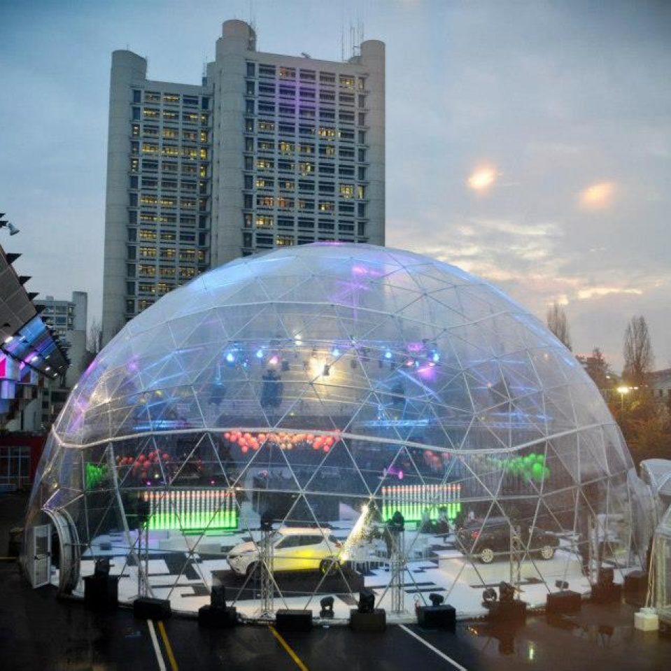 Dome 28 meters in diameter, placed in Bologna (Italy) to promote new models of Nissan Juke. At the Bologna Motor Show 2012 Nissan has brought its range of sport cars and surprised even the unique Juke-R. Exhibited for the first time in Dubai in January 2012 this car has been a great success so the Ray Mallock Ltd. under the supervision of Nissan Technical Centre Europe decided to continue the development of the car. The engine is the 3.8 V6 twin-turbo from GT-R r35 with 545 hp capable of pushing the little juke to 275 km/h and sprint from 0 to100 km/h in about 3 seconds