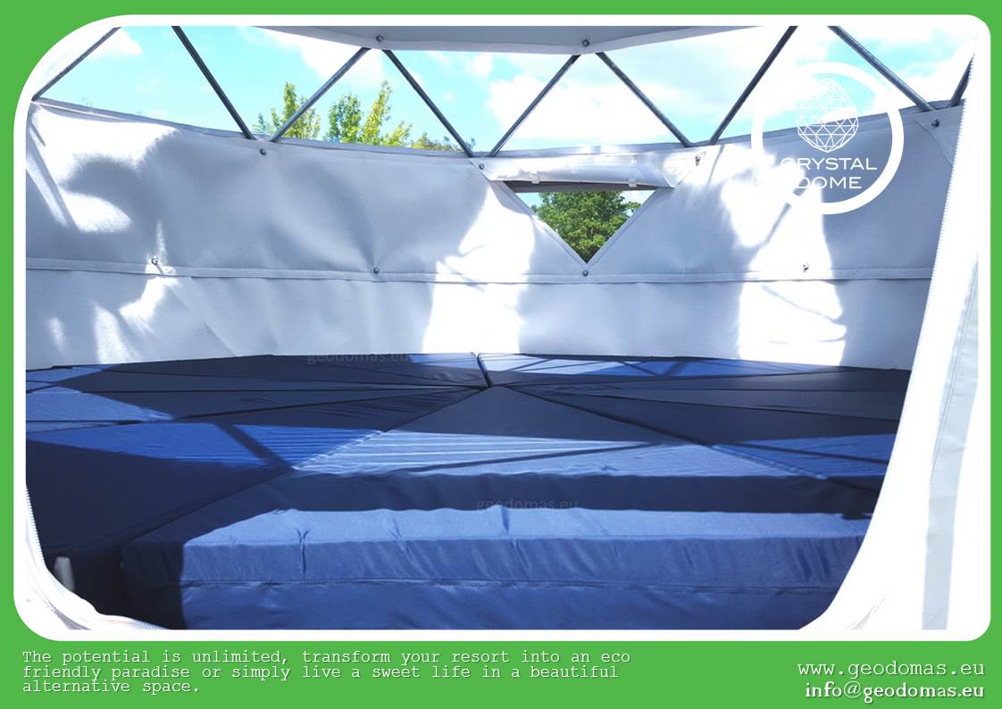 The dome offers a versatile interior: decorated with beautiful fabric stretched walls, enhancing coziness and ensuring excellent sound and thermal insulation. Its spacious interior, free of internal supports, maximizes the open-space experience 🪟✨.
