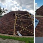 Triangular shaped panels, façade slabs COSMO PANEL 25mm (Basic option), PVC-XPS-PVC structure of panels. Fastening elements for the slabs with a gasket. Installation glue set for seal treatment. White facade sealant-glue for the finishing and decorative works. A tin perimeter window sill for the waterproofing of the foundation. Gravitational ventillation system at the lower perimeter of the dome. A full installation set, and documentation for facade assembly.