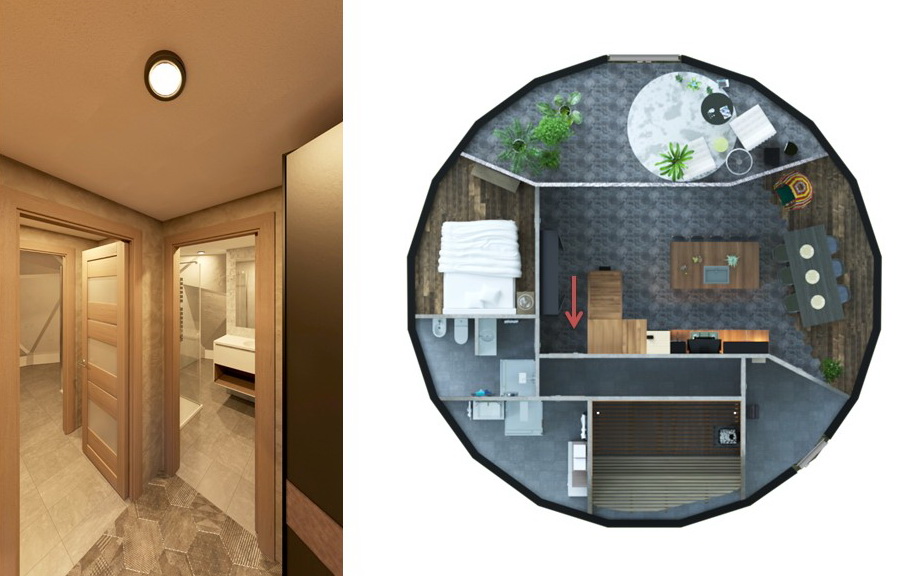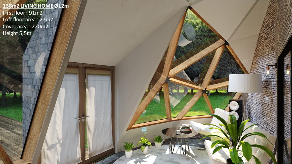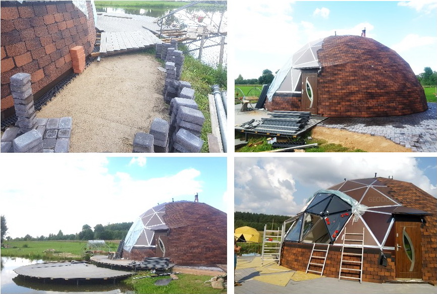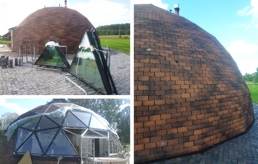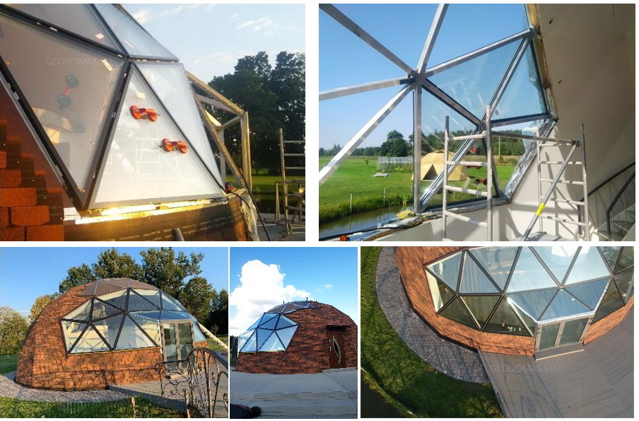 Triangular shaped panels, façade slabs COSMO PANEL 25mm (Basic option), PVC-XPS-PVC structure of panels. Fastening elements for the slabs with a gasket. Installation glue set for seal treatment. White facade sealant-glue for the finishing and decorative works. A tin perimeter window sill for the waterproofing of the foundation. Gravitational ventillation system at the lower perimeter of the dome. A full installation set, and documentation for facade assembly.