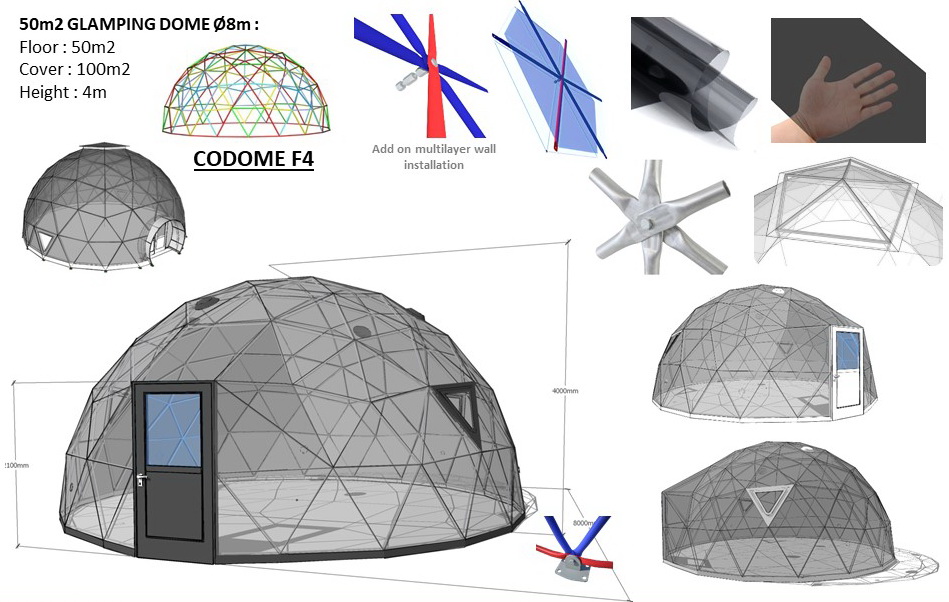Glamping Domes do not require any columns, load walls or columns inside to allow the customers to use the maximum available area. By using steel structural elements structure becomes sustainable in terms of weather factors, livetime and loads.- The structures can be connected with tunnel paths;