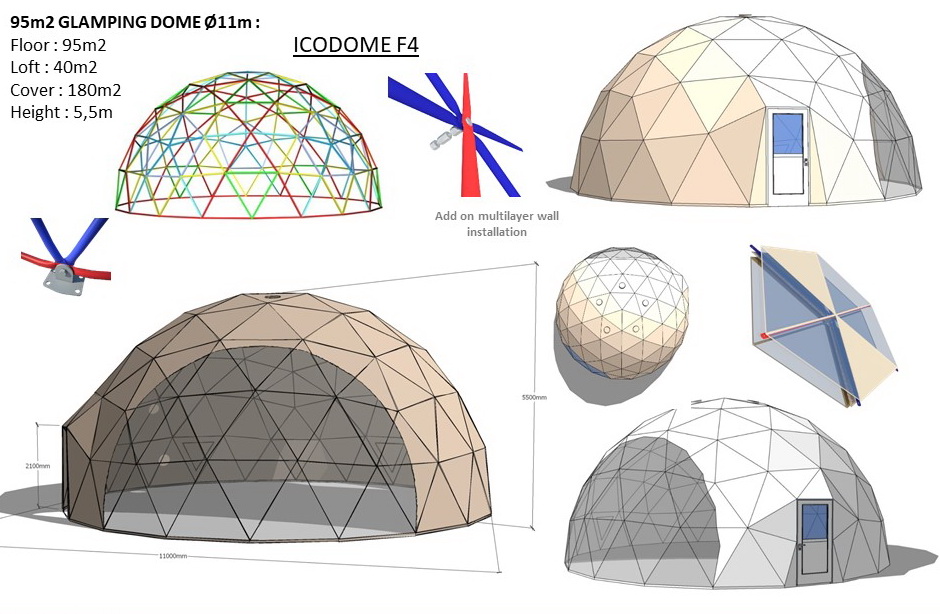 Glamping Domes do not require any columns, load walls or columns inside to allow the customers to use the maximum available area. By using steel structural elements structure becomes sustainable in terms of weather factors, livetime and loads.- The structures can be connected with tunnel paths;