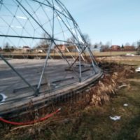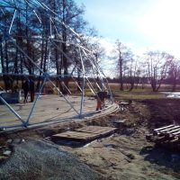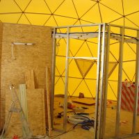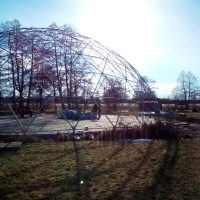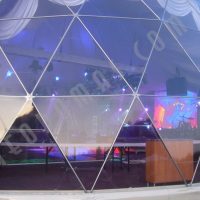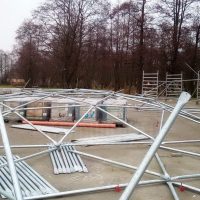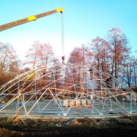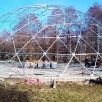 Metalinė, cinkuota sferinės formos konstrukcija | Kupolo formos paviljono rėmas pagamintas iš cinkuoto plieno, vieno varžto jungtys , apatinės jungtys kupolo tvirtinimui.
