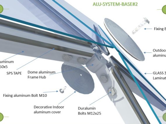 The construction carcass is produced from aluminum structural profile parts for structural facades, the parts include a sealing rubber, fixing kit. Steel connection hubs: STAR type – 4-5-6 directions, powder painted. A set of stainless steel rivets 6.4 mm for carcass construction.