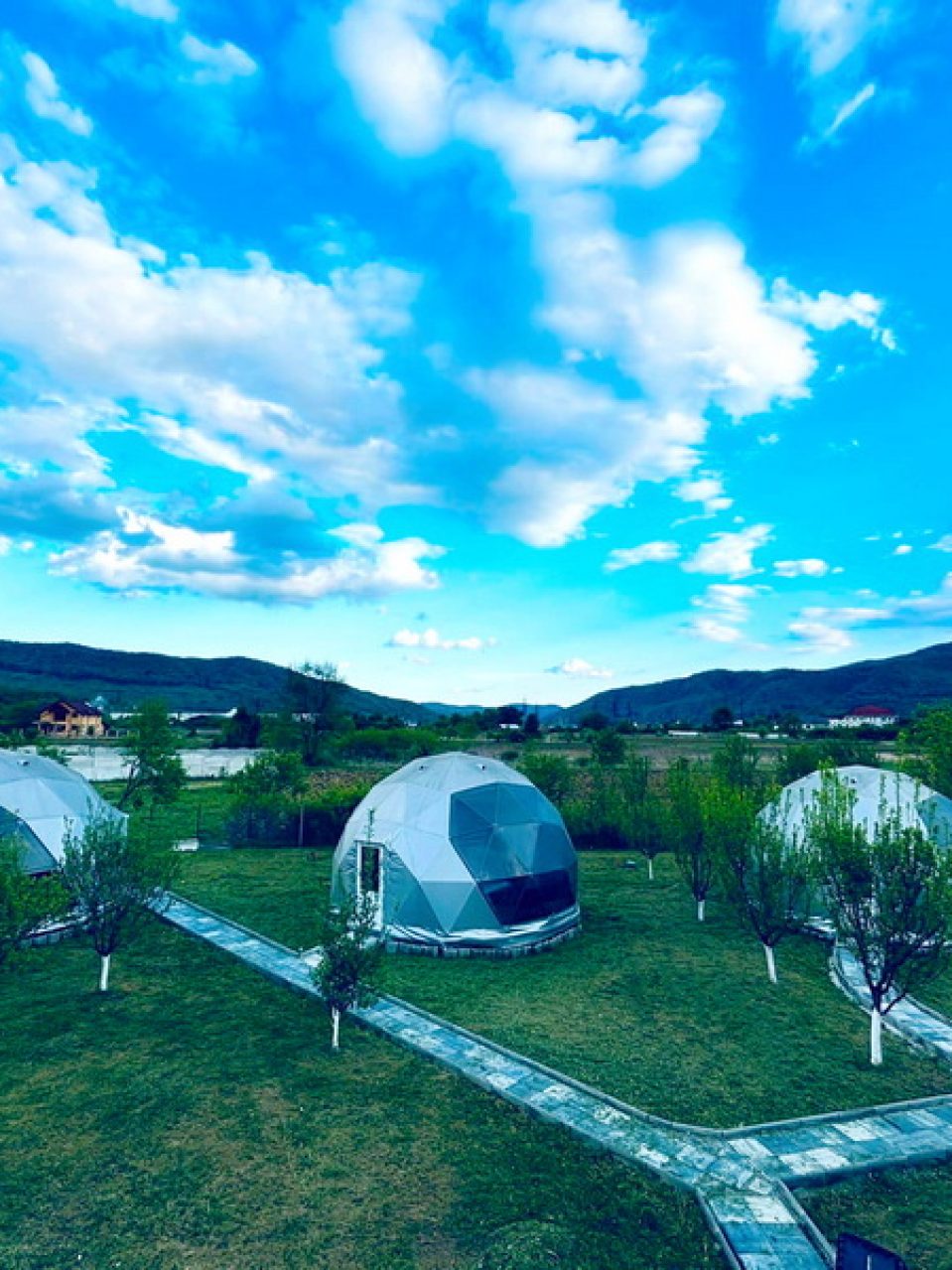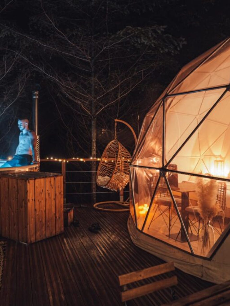 The domes are equipped with state-of-the-art amenities: each dome features a spa area with thermal baths, a private terrace, and a jacuzzi, ensuring that guests enjoy unparalleled comfort and luxury. The resort also offers high-end amenities such as a flat-screen TV, free Wi-Fi, air conditioning, a refrigerator, a microwave, a minibar, and a kettle. These domes are not just a camping site but a sanctuary where every detail is designed for your peace and pleasure.