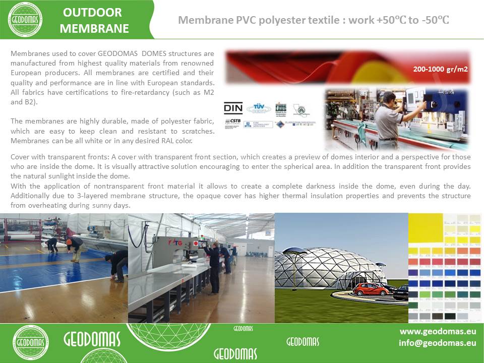 Kupolai aprūpinti termo membrana ir akustinėmis užuolaidomis, todėl puikiai tinka tiek šiltajam, tiek vėsesniam sezonui. Panaudotos medžiagos ne tik izoliuoja garsą, bet ir padeda išlaikyti komfortišką mikroklimatą viduje, kas ypač svarbu ilgų renginių metu.