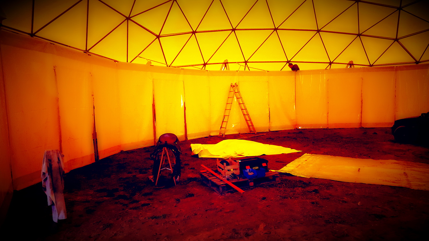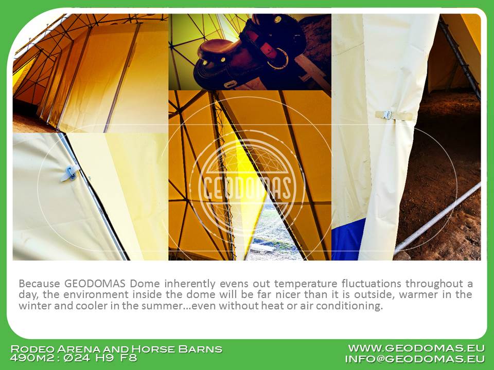 Visa konstrukcija padengta termo membrana, užtikrinančia puikų mikroklimatą viduje. Akustinė vidinė membrana leidžia išvengti aidų ir triukšmo, kas labai svarbu dirbant su arkliais.