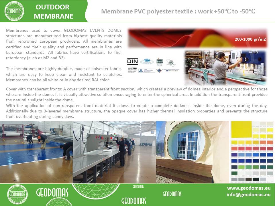 Mūsų tentas ne tik gražiai atrodo, bet ir patvari naudoti. SPA kupolo tentas, suprojektuotas su dvigubo sluoksnio oru uždarytomis sienomis, gali daug dienų stovėti be pūstuvo. Jūs ramiai mėgaujatės nuostabia gamta, kai turite SPA. Jūsų projektuose gali būti skirtingos spalvos ir formos.